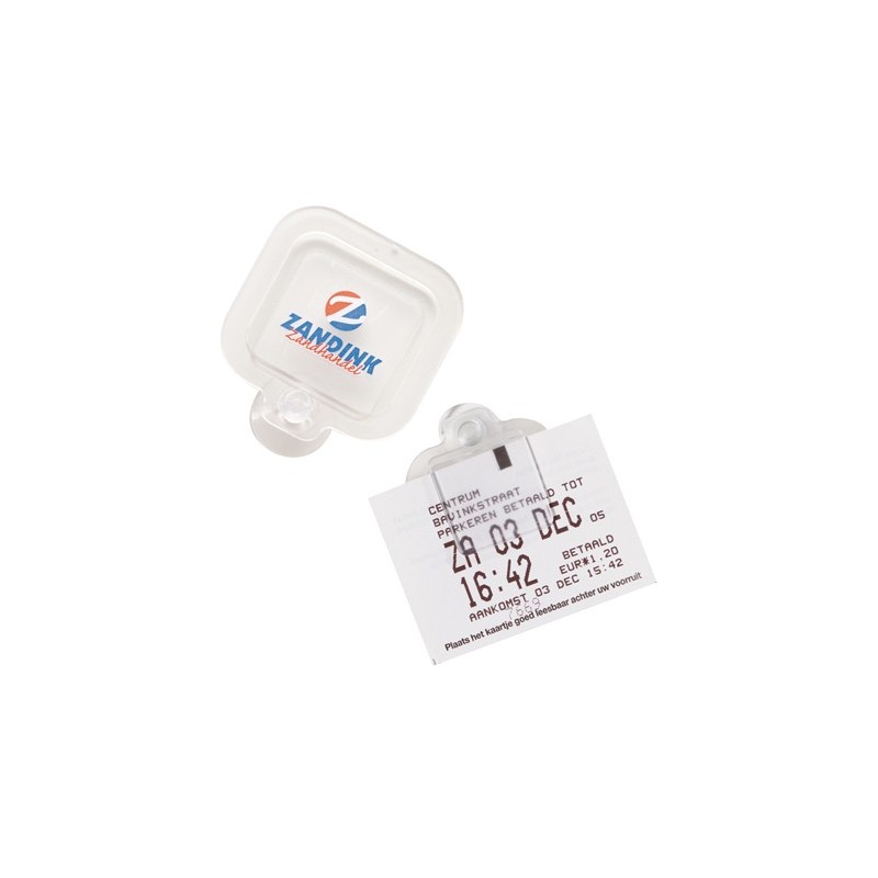 Parkeringsbillet holder med sugekop til og sætte i bilen 50x49x10 mm. 4g. Trykflade 25x25 mm. prisen er Incl 1 farve tryk for fgl farvetryk er prisen v/250=1,50, 500=0,90, 1000=0,75, 2500, 0,65, 10,000=0,50. Trykopstart 530,00 kr.