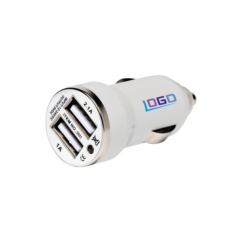 12-24V USB strømudtag til bilernes cigartænder. 58mm x 25mm Ø, trykflade 18x5mm. Mobiltelefoner og musikafspillere port 1A. Tablets port 2.1A. Pr tryk v/200stk=4,40kr, 400=4,25, 800=4,10, 1600=3,85, 3200=3,60. Trykopstart 530,00kr.