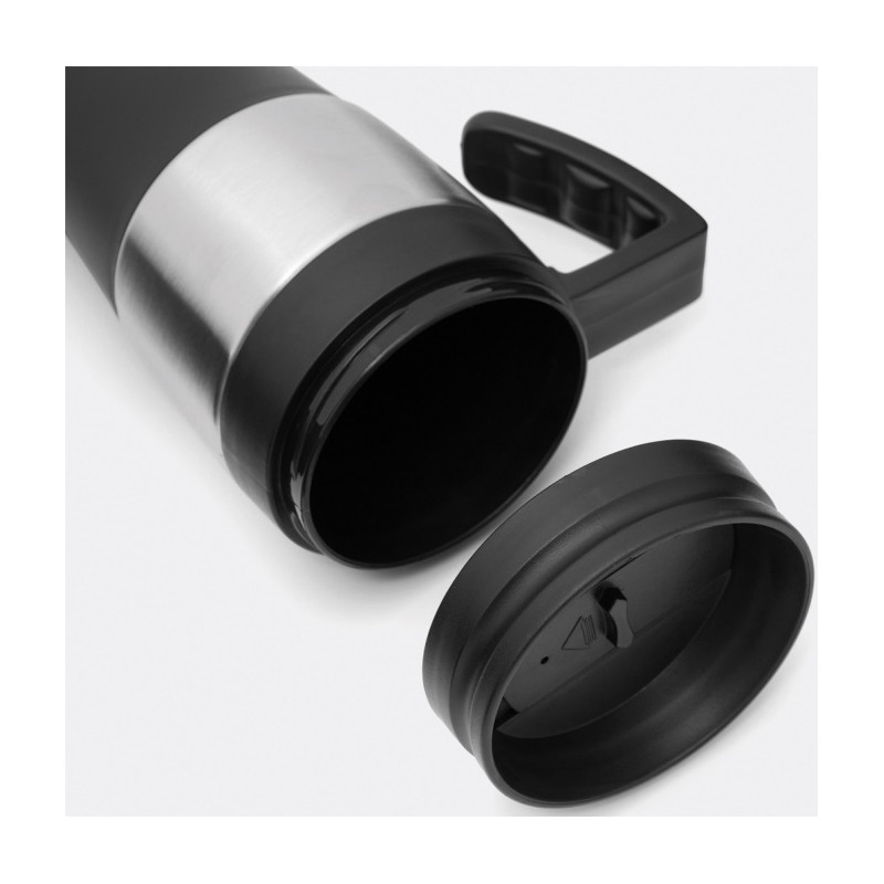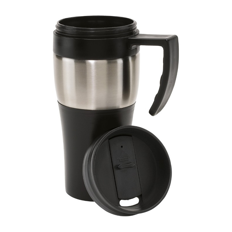 Bil termokrus i rustfri stå og plast, skruelåg, skydelig drikke åbning/lukning. 2 lags termokrus. På termokrus ses reklamen hver gang krusene ses. Hver gang lagres reklamen i hukommelsen. Mennesker er tilbøjelige til at vælge de leverandører, og produkter der ligger øverst i hukommelsen.