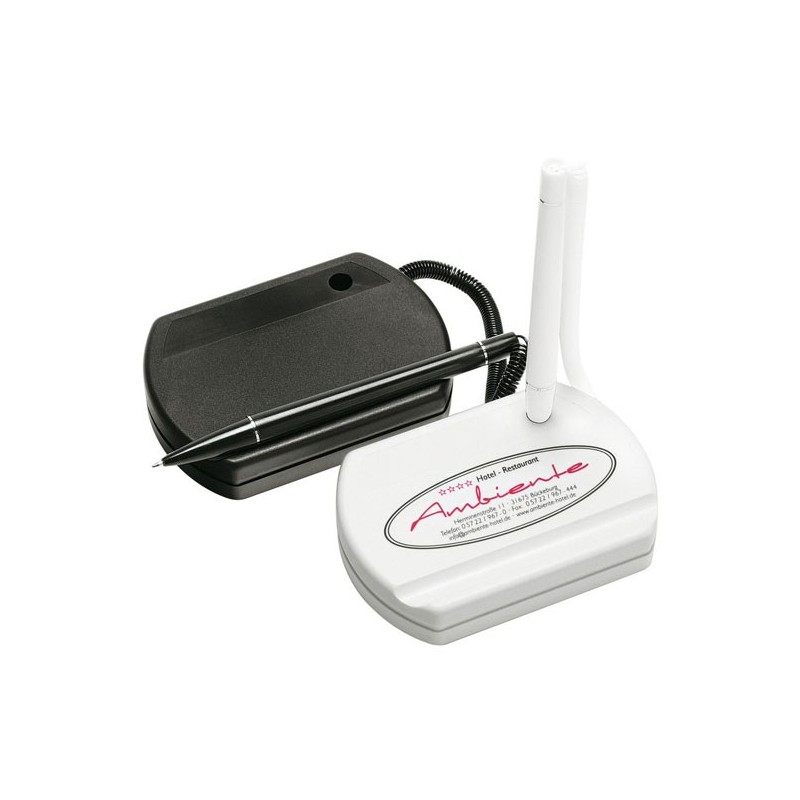 Kugelepenne bordstander 10,5x7,5 cm. 130g. Trykflade 50x12 mm. Eller 85x30 mm. (max 4 faver/tryk) Pr. Tryk/v 100=3,40, 300=3,00, 500=2,40, 1000=1,80, 2500=1,60. Trykopstart 530,00 kr.