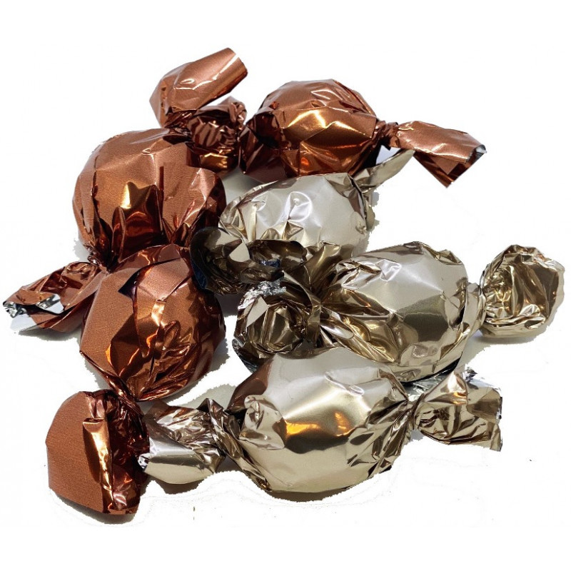 Foto viser bøtte med 1 kg chokoladekugler. Bøtterne med 500 gram chokoladekugler er halvt så store.