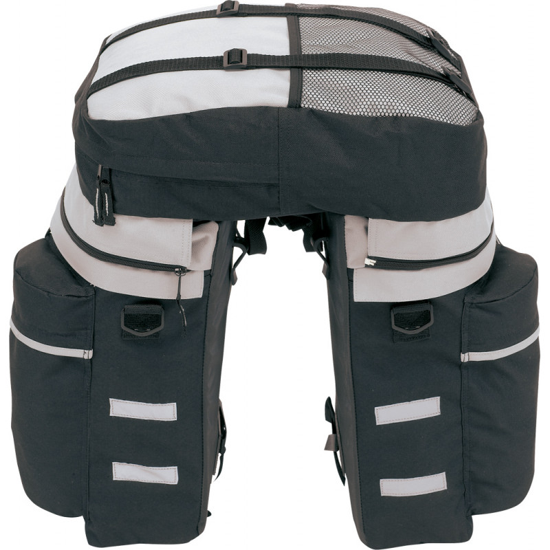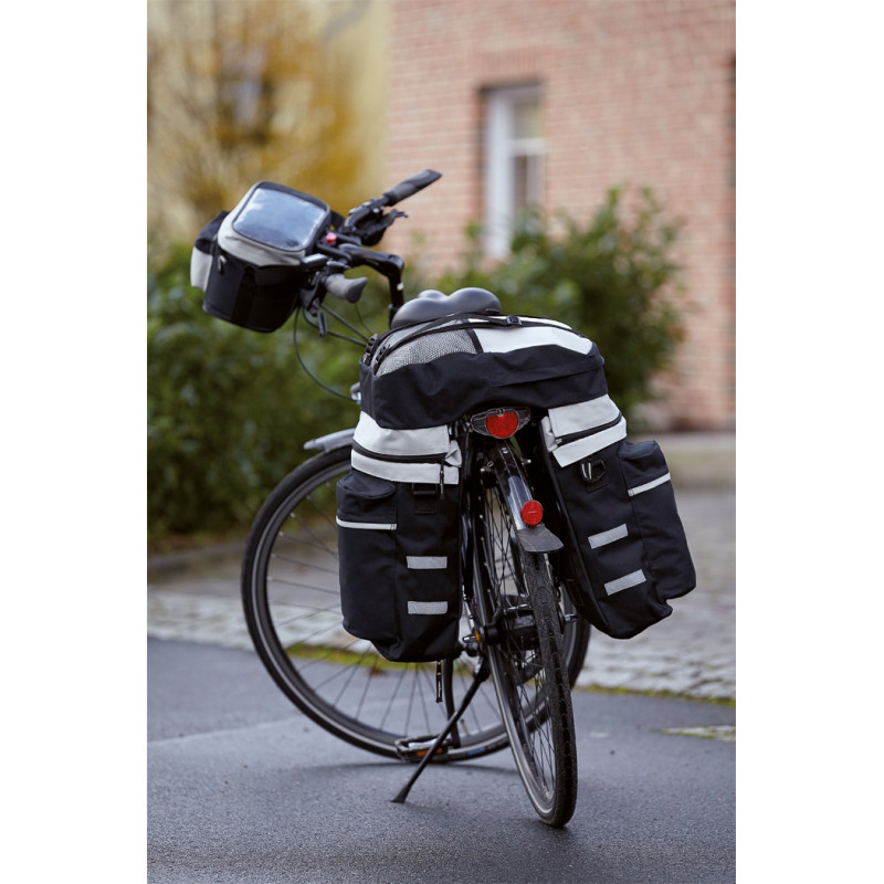Cykeltasker, 3-delt sæt. 2 stk sidetasker med reflekterende striber samt 1 stk rygsæk, med indbygget regnslag dækkende taskerne, 600D polyestrer.