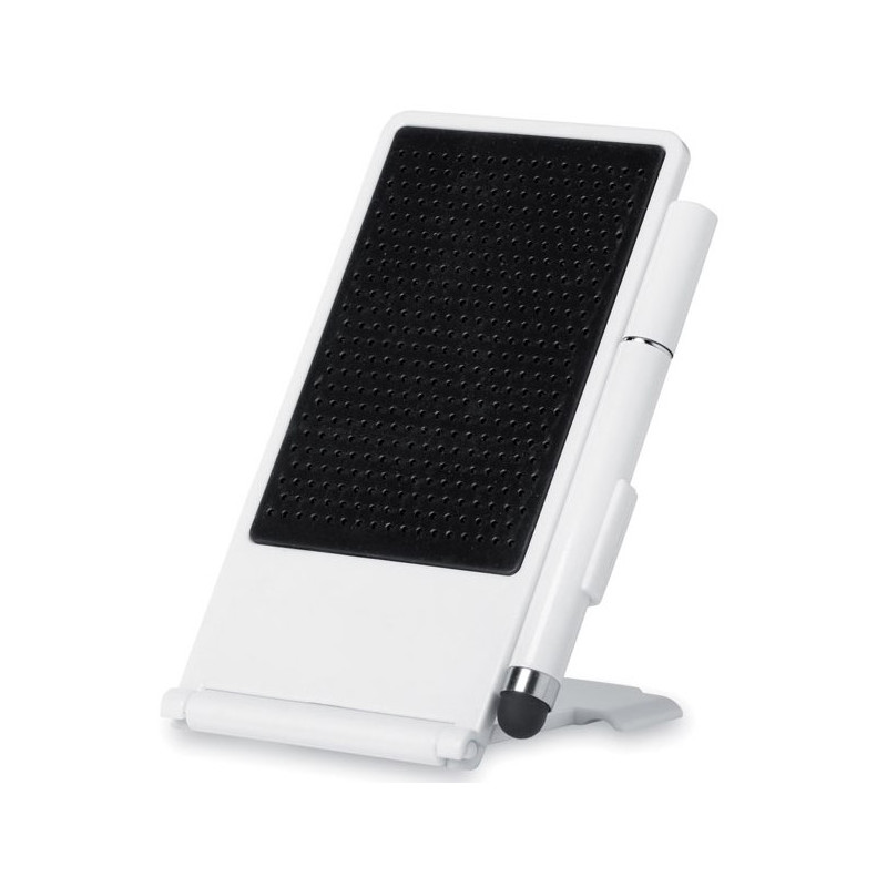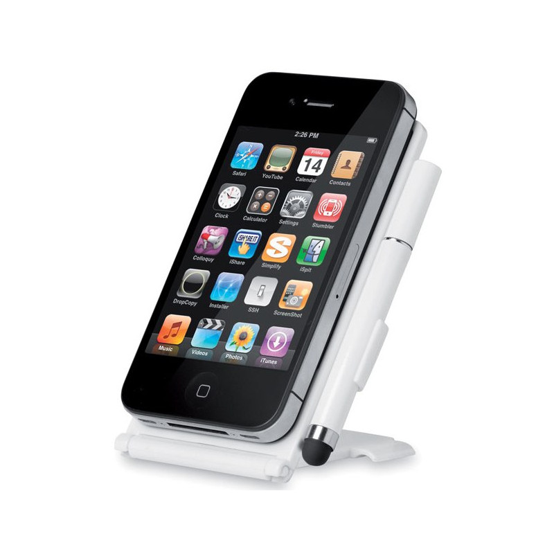 Telefonstandere 60x115x7mm med antislip beklædning så telefonen ligger fast herudover kuglepen med silicone spids (gør det lettere at ramme små taster) samt blåt skriveblæk. En brugbar reklameformidler til skriveborde, værkstedet, stuen, eller i køkkenet, når bage- og madopskrifter læses på telefonen samtidig med kokkereringen. Hver gang telefonen ikke er i telefonstanderen, ses Jeres reklame.