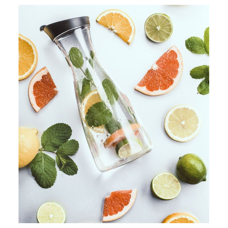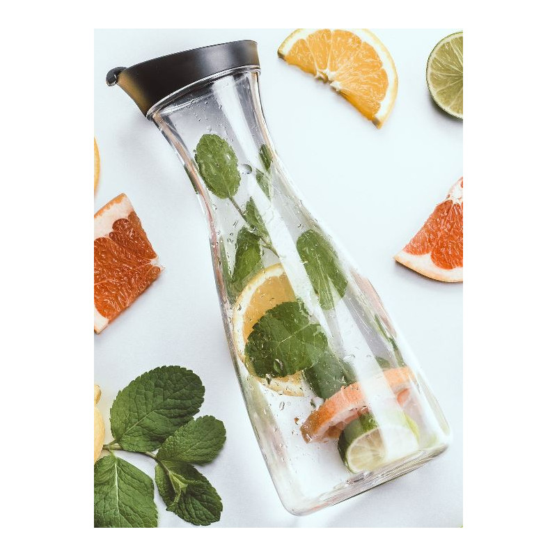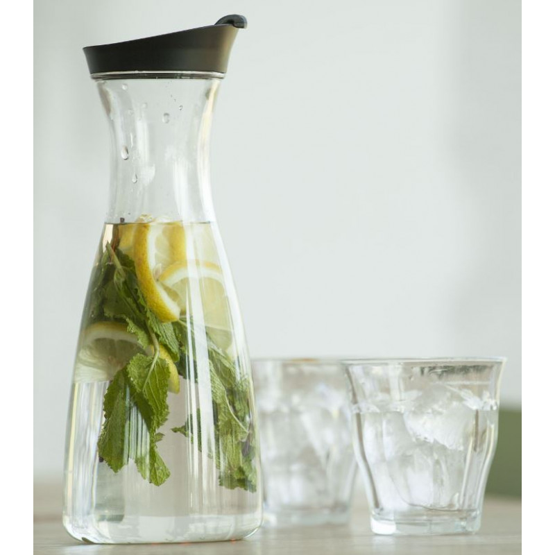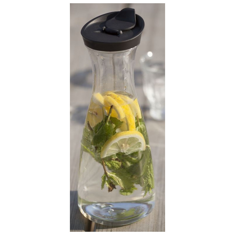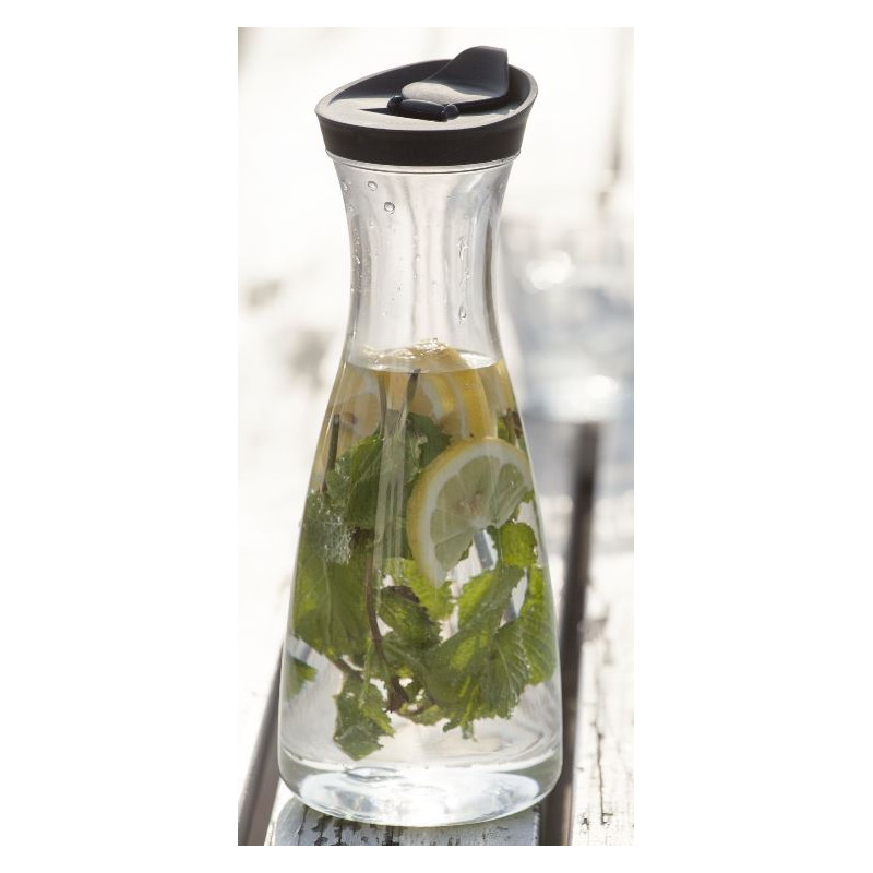 Karaffel, 1100ml. Elegant karaffel i BPA-fri Titan plast. Solidt plast skruelåg. Hældetud og praktisk klick lukning. Flot som bordkaraffel til vand, vin, saft mm. Stor åbning gør det let at tilsætte isterninger, frugtskiver, blade mm. Eksperimenter med at brygge dit ejet saftevand, via ilægning af frugter og blade. 10cm Ø x 26,2cm. 124 gram.