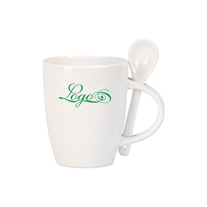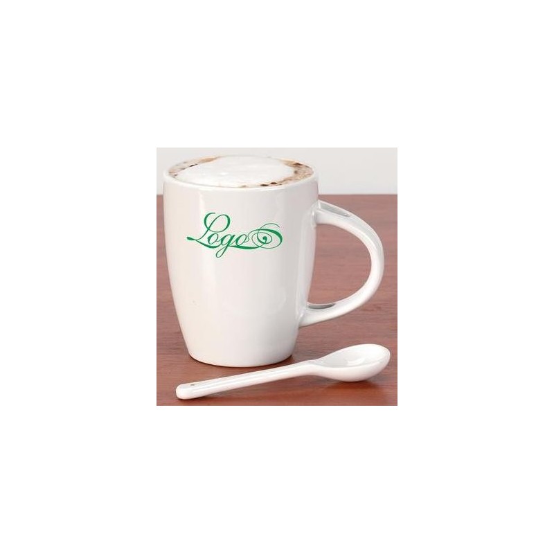 Porcelænkrus med ske i hanken. 85mm Ø x 103mm høj, 380ml, 331 gram. Kolli á 24stk. Trykflade 4x4cm. Trykopstart 530,00kr. Pr 1. trykfarve v/50stk=13,00kr, 168=8,60, 336=8,50, 672=8,15, 1344=7,85, 2688=7,75. Pr fgl trykfarve v/168stk=3,60kr, 336=3,60, 672=3,65, 1344=3,60, 2688=3,60.