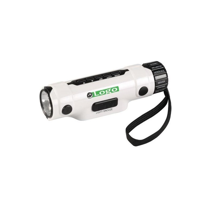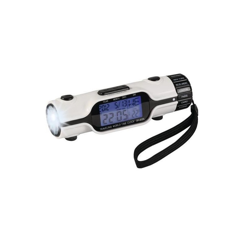 Lommelampe med skarpt hvidt lys fra 3 kraftige LED lamper. Termometer med C/F angivelse. Ur 12/24 time angivelse. Let indstilleligt verdensur med 18 verdensomspændende hovedstæder. Fantastisk under rejse, ligesom en stor hjælp for de der beskæftiger sig med im- og export, da det er let at se hvad klokken er de forskellige steder..