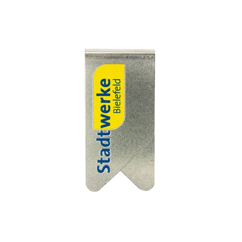 Papirclips i rustfri stål med reklame, 0,25mm rustfri stål, 29x14mm, Incl farvefoto digitaltryk på èn side. Rummer op til 15 papirark. Prisen er pr æske. Leveres i papæsker fremstillet af genbugspap. 100 stk papirclip pr æske. Genbruges igen og igen, og hver gang ses Jeres reklame af modtageren.