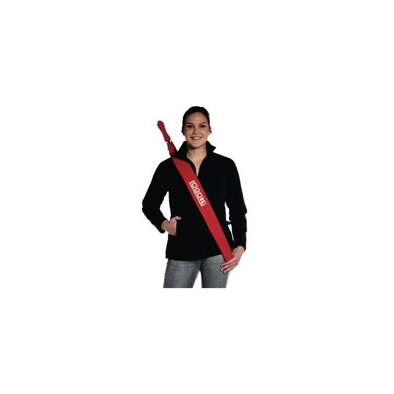 Paraply med skulderrem, 103cm Ø x 82cm, 392gram, 190T nylon skærm, metal stel og skaft. Ergonomisk skum håndtag, Velcro lukning. Med handy rygtaske med integreret skulderstrop. Trykflade paraply 15x12cm. På taskestroppen 28x4,5cm. Pr tryk v/72stk=8,60kr, 144=8,40, 288=8,15, 576=7,85, 1152=7,40. Trykopstart 570,00kr.