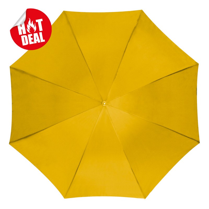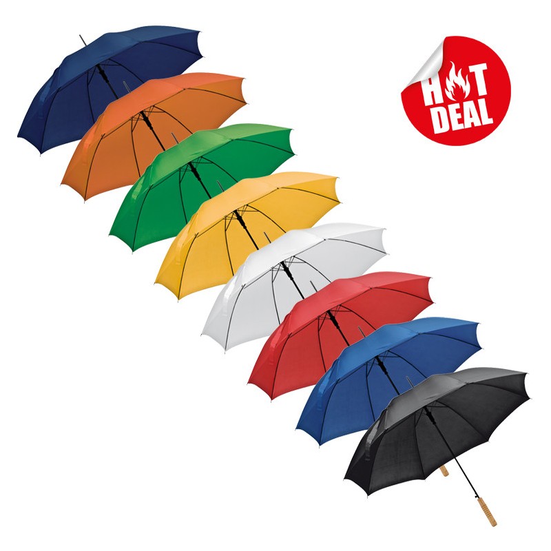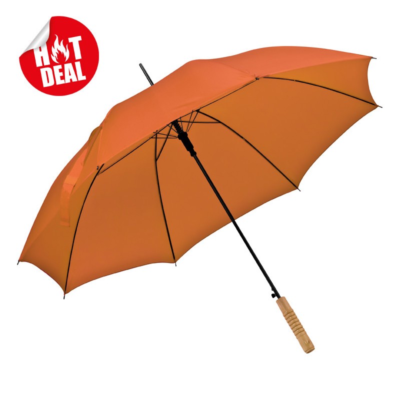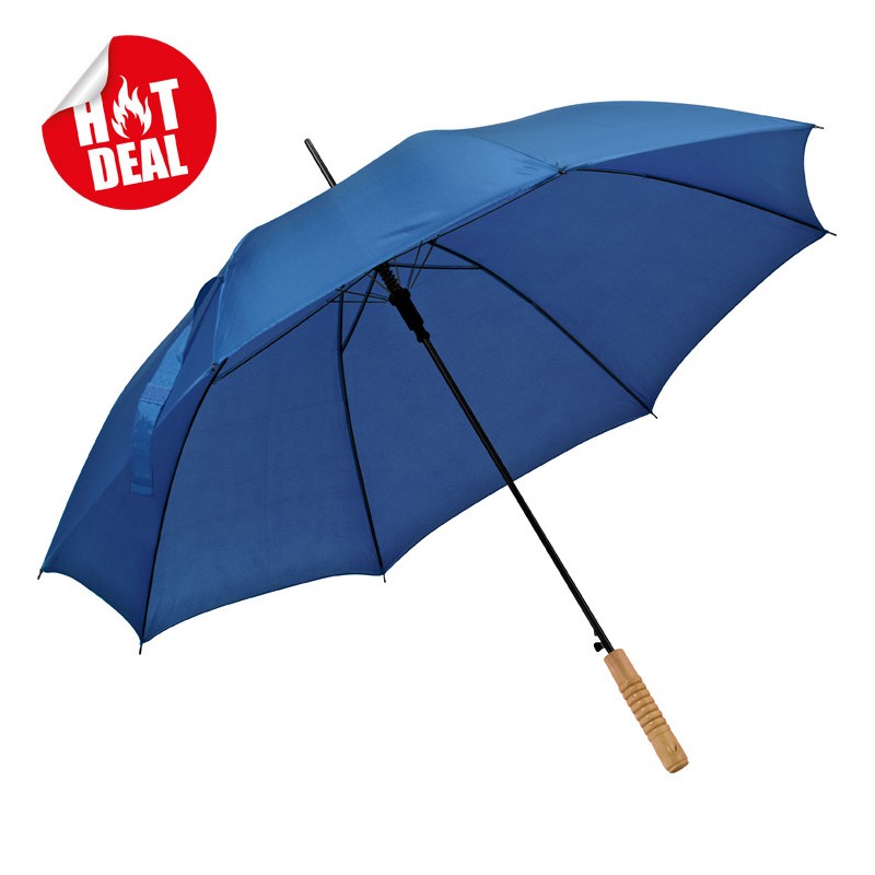 Flotte automatiske paraplyer med logo. 100cm Ø x 83cm, Træhåndtag og metal skaft.