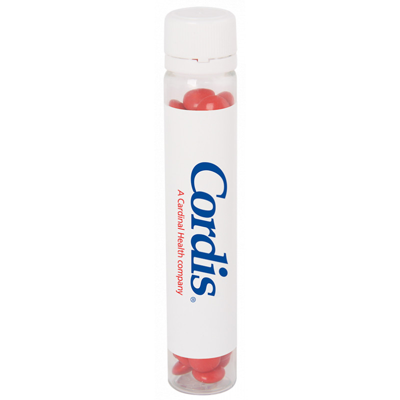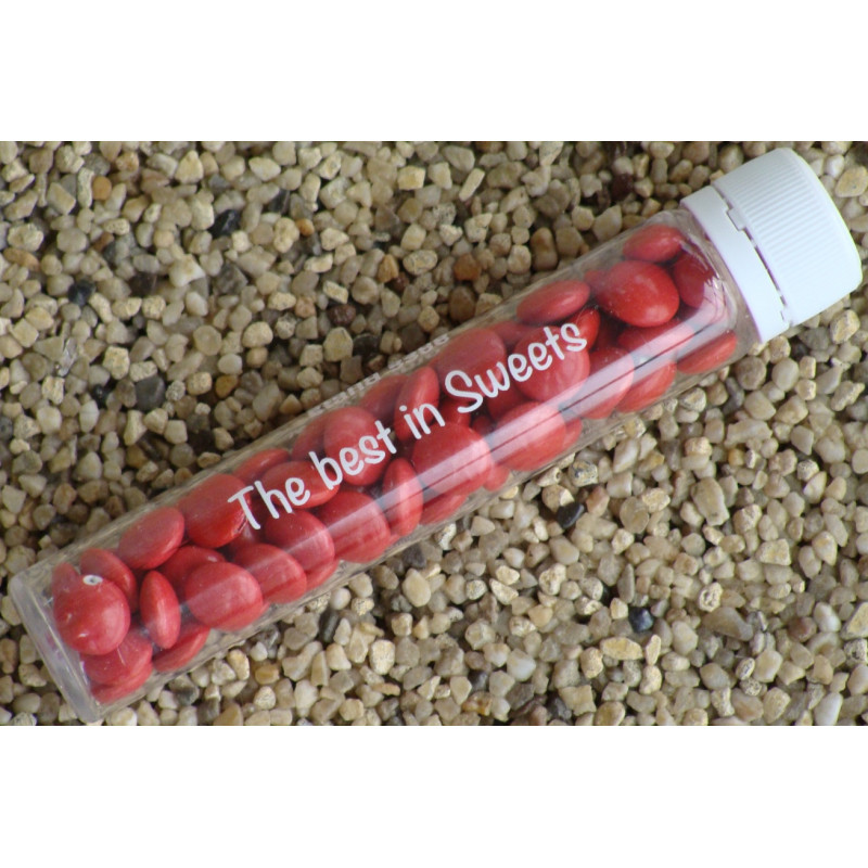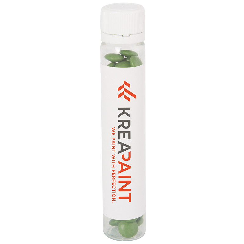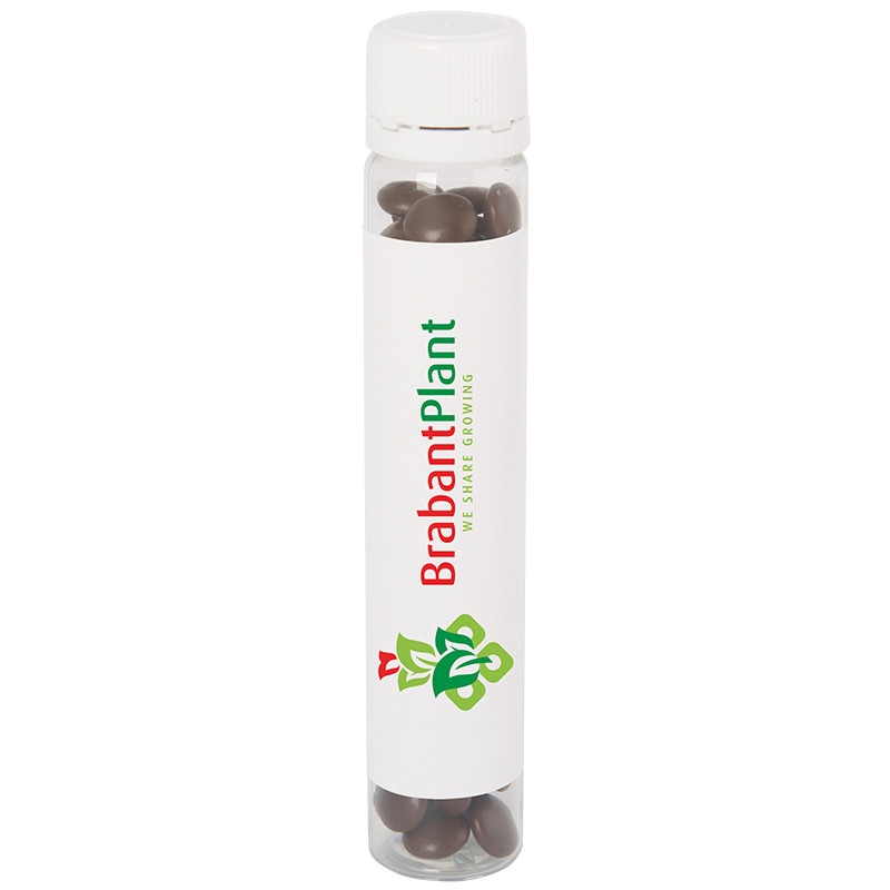 Chokoladeknapper i rør 2cm Ø x 11cm, Lækre chokoladeknapper, som før verden gik af lave. Pastillerne kan leveres i farver efter ønske, også blandede farver efter ønske, så oplagt at få chokoladeknapperne i Jeres firmafarver. Prisen er incl flerfarvetryk. Reklame der forbindes med noget positivt er extra effektiv. Underbevidstheden gemmer reklamen som positiv og anbefalelsesværdig.