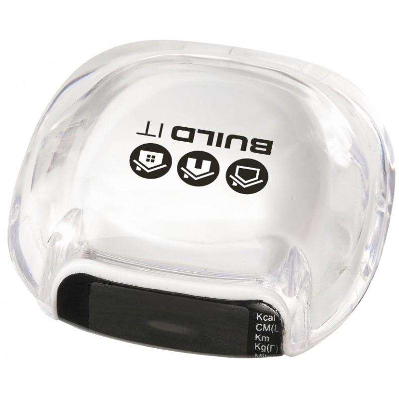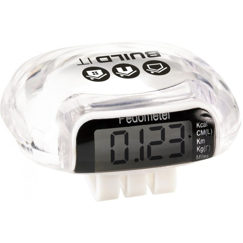 Skridttællere, Pedometere med klemme til montering på tøjet. Incl. batteri og brugsanvisning. Viser afstand i km og miles, antal skridt og forbrændte kalorier. Pakket enkeltvis i æske, 29 g. Mål 4,5x4x4,5x2cm. Trykflade 20x20mm. Pr tryk v/60stk=6,29kr, 120stk=5,69, 240stk=5,40, 480stk=5,27, 960stk=5,00, 1920stk=4,85. Trykopstart 530,00kr.