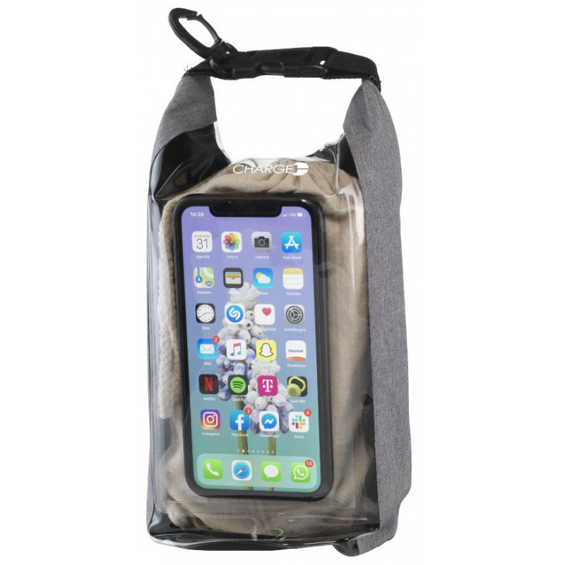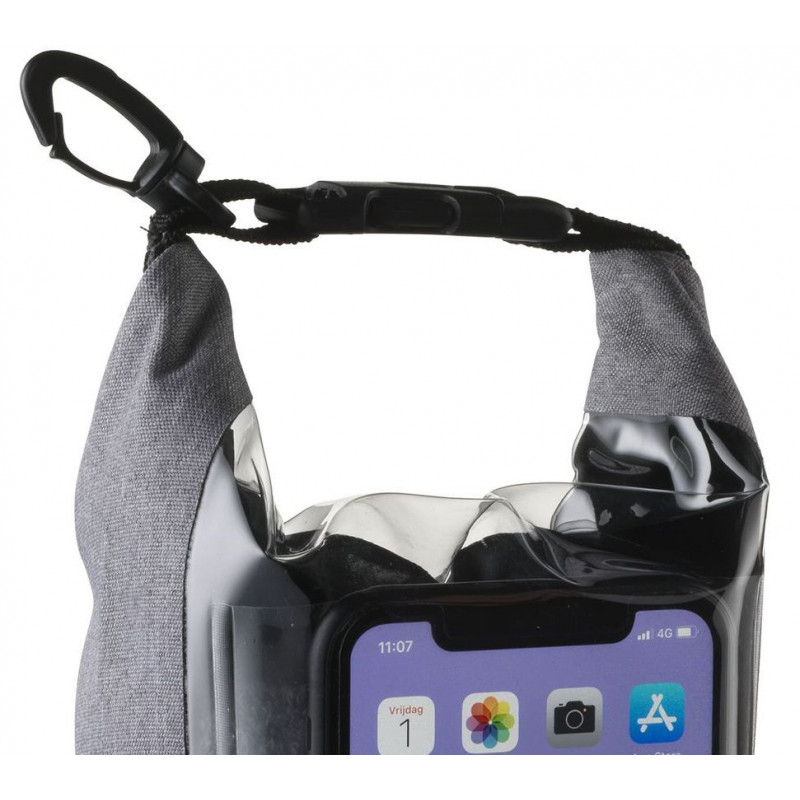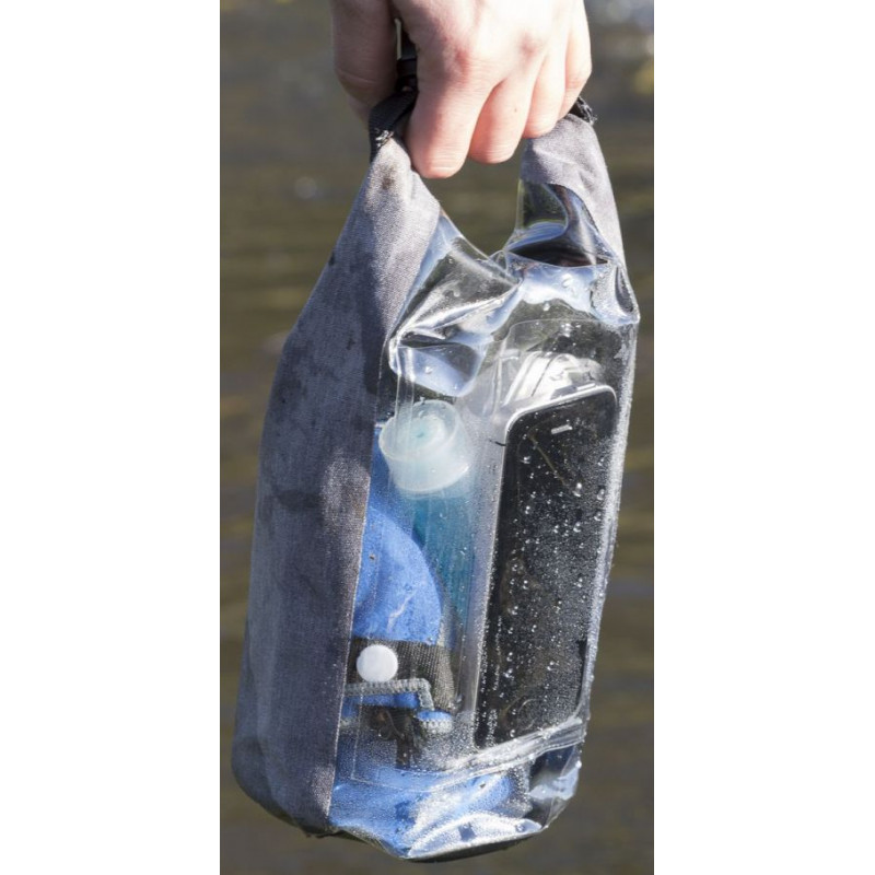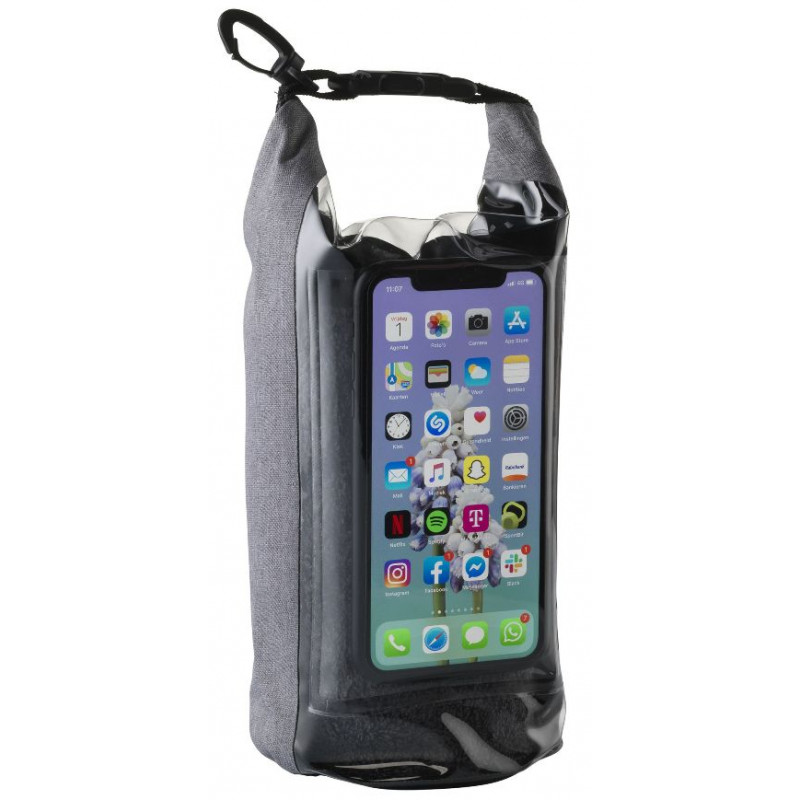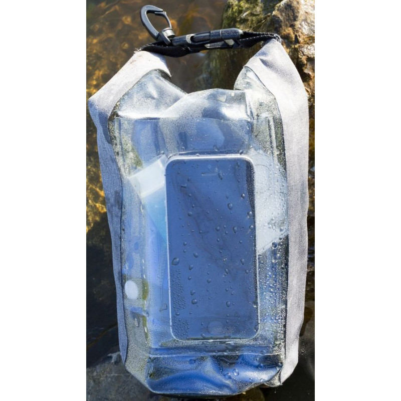 Vandtæt taske 29x18x11,5cm, 69g. Indhold 2,5 ltr. Robust taske med rullelukning øverst. Front i transparent PVC. Touchskærm kan betjenes gennem ruden. Tasken flyder på vandet. Bedskytter mod vand, men må ikke nedsænkes i vand. Karabinhage gør det let at montere tasken på anden bagage.