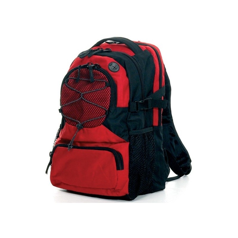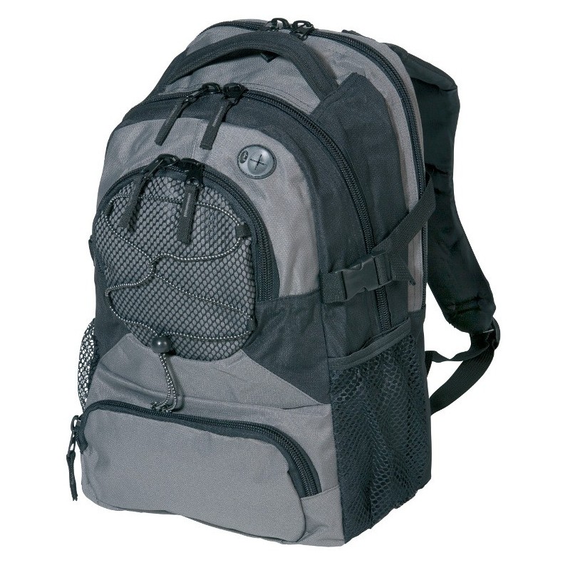 Rygsække i 300 D ribstop nylon/pvc, stort hovedrum med lomme til PC, stor frontlomme med 3 inderlommer, 2 frontlommer, flere inderlommer, bærehank, polstrede skuldertropper, udgang til earplugs, brystrem, kraftige lynlåse. Størrelse: 29 x 44 x 18 cm