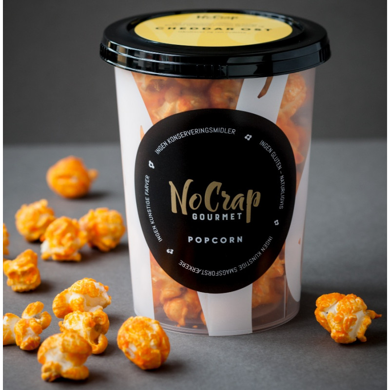 Model 1: Cheddar. Fyldige popcorn med perfekt afrundet smag af lagret dansk cheddar og havsalt fra Læssø.