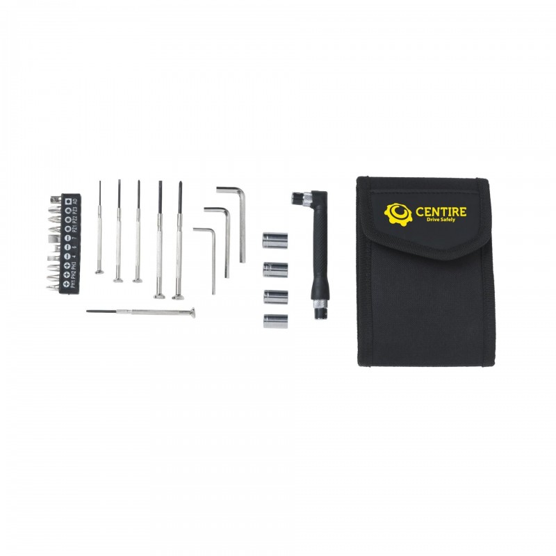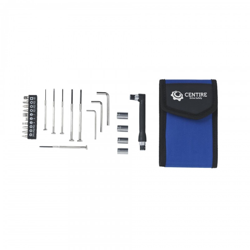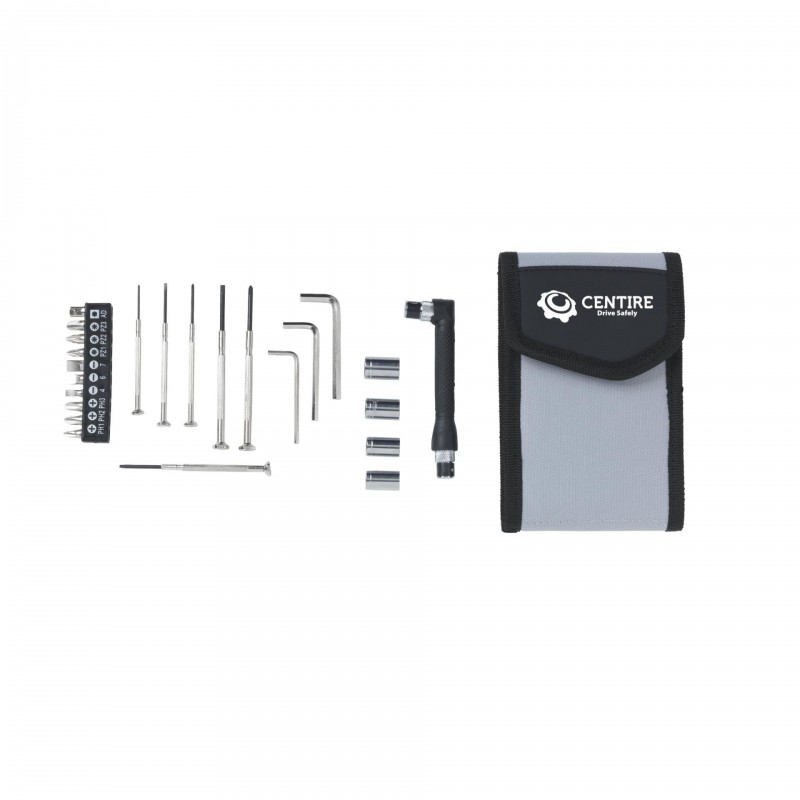 Værktøjssæt i 24 dele, i en nylontaske med velcrolukning 17 x 10,5 x 2,5cm. Hvert sæt i en æske. 358g.